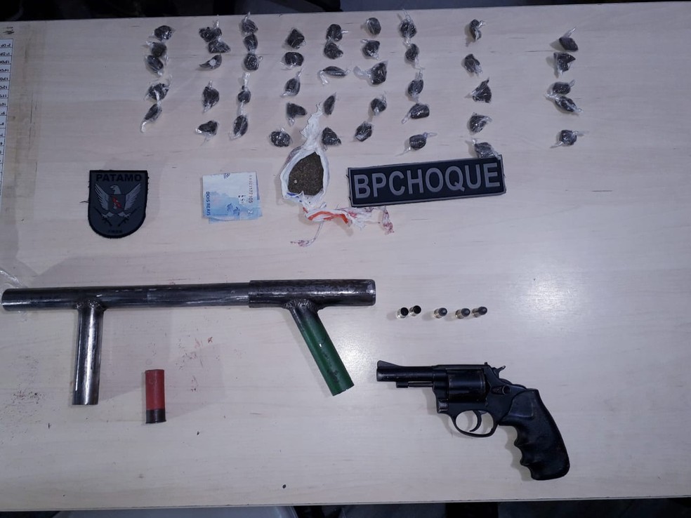 Com os suspeitos, foram apreendidos um revólver e uma espingarda calibre 12 de fabricação caseira, além das munições; 45 trouxinhas e uma "porção média" de maconha; e uma motocicleta roubada.